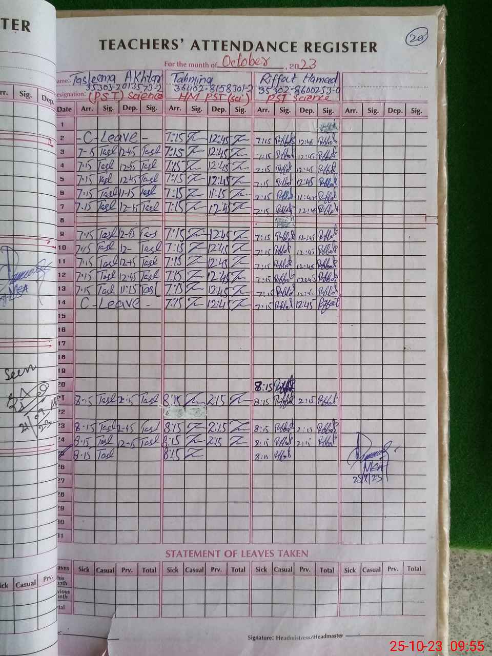 | CNIC | Full Name | Designation | R/C | Absence During Last Calender Month |