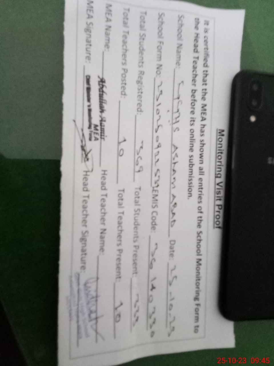 | Attendance Register | Head Teacher | MEA with School | Visit Proof |
