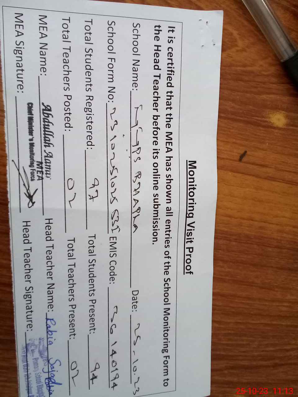| Attendance Register | Head Teacher | MEA with School | Visit Proof |