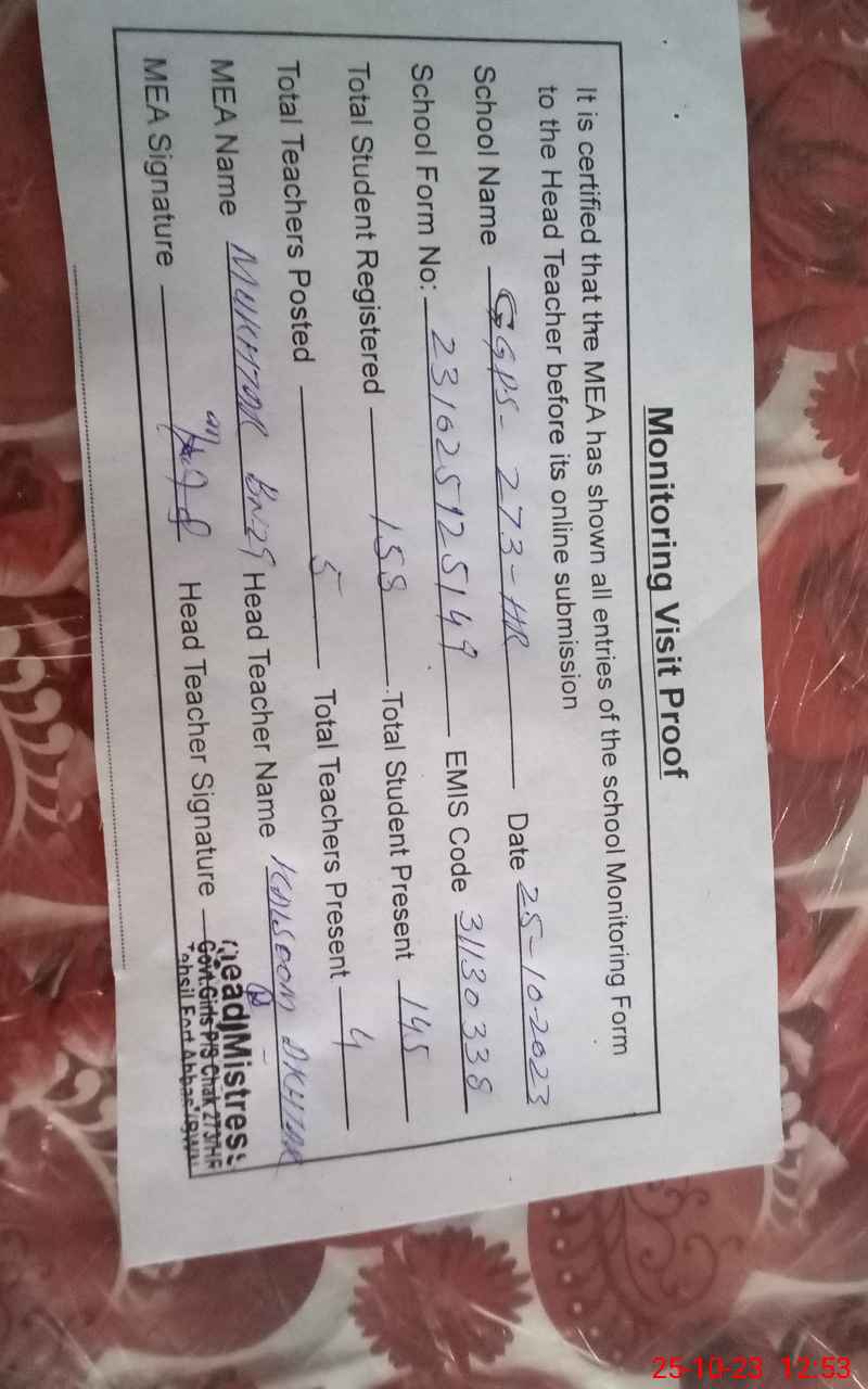 | EMIS Code: 31130338 | Name of School: GGPS CHAK NO 273 HR | |||