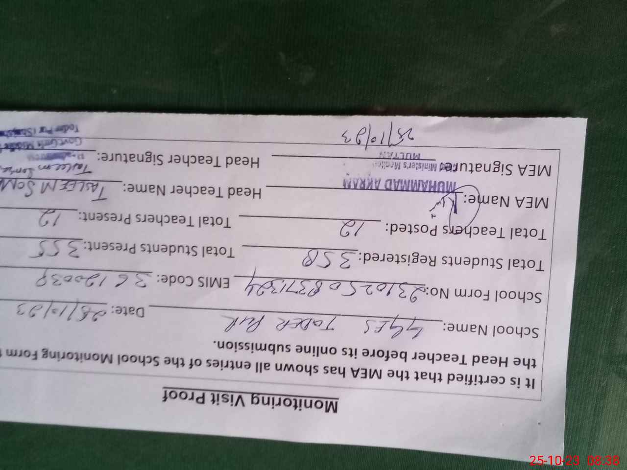 | Certified that this School was Inspected by the Undersigned MEA/DMO Today and the Information Stated Above is as Per Record. | |||||