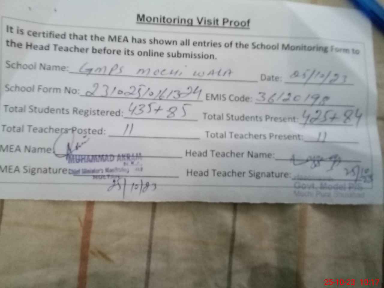 | Certified that this School was Inspected by the Undersigned MEA/DMO Today and the Information Stated Above is as Per Record. | |||||
