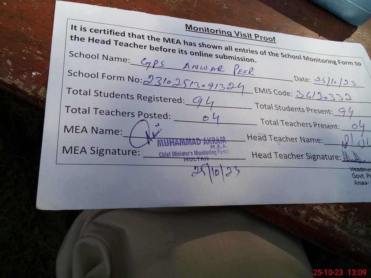 | Attendance Register | Head Teacher | MEA with School | Visit Proof |