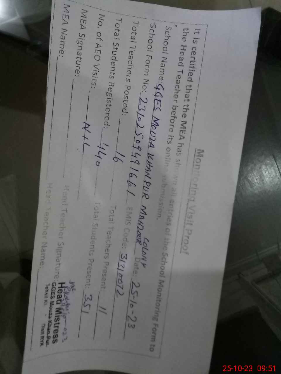 | EMIS Code: 31310072 | Name of School: GGES MOUZA KHAN PUR MANZOOR COLONY | |||