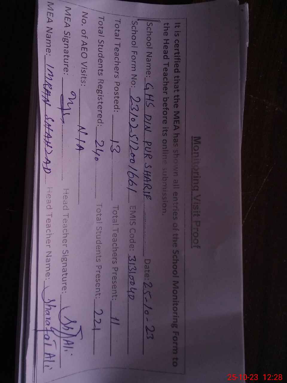 | Attendance Register | Head Teacher | MEA with School | Visit Proof |
