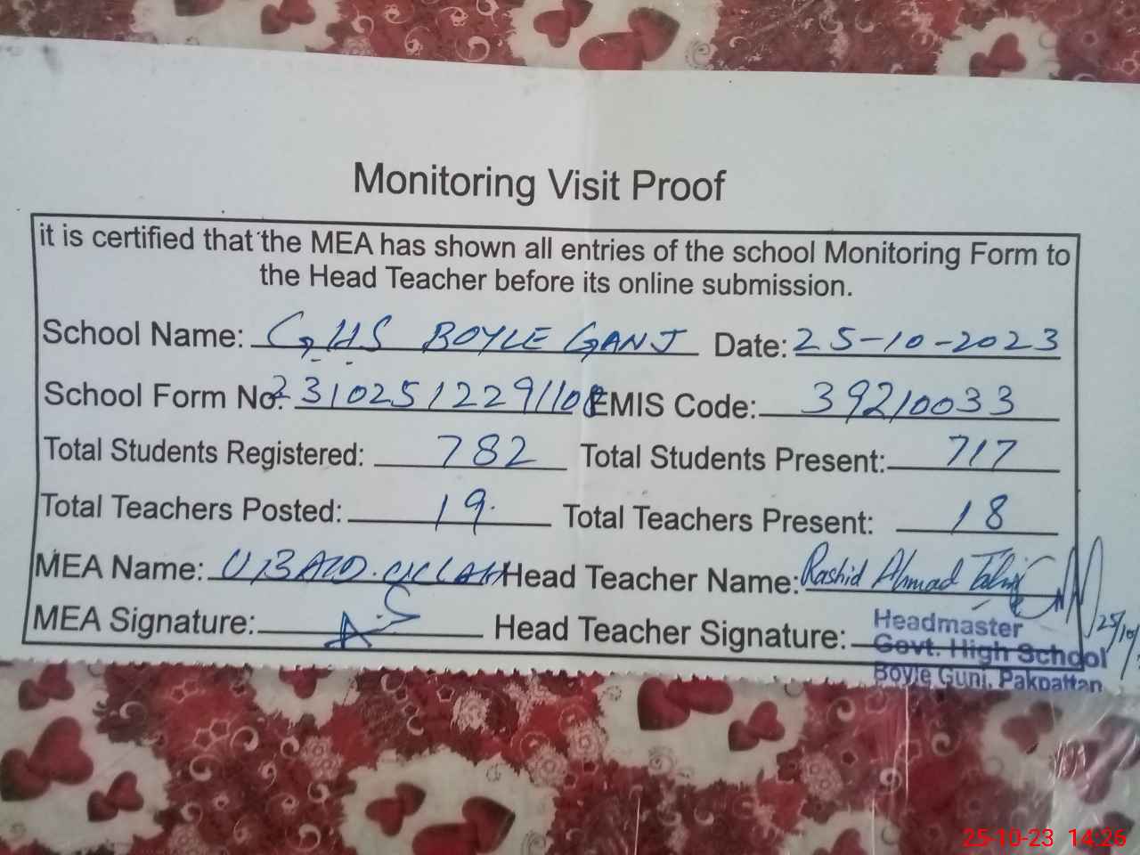 | Certified that this School was Inspected by the Undersigned MEA/DMO Today and the Information Stated Above is as Per Record. | |||||
