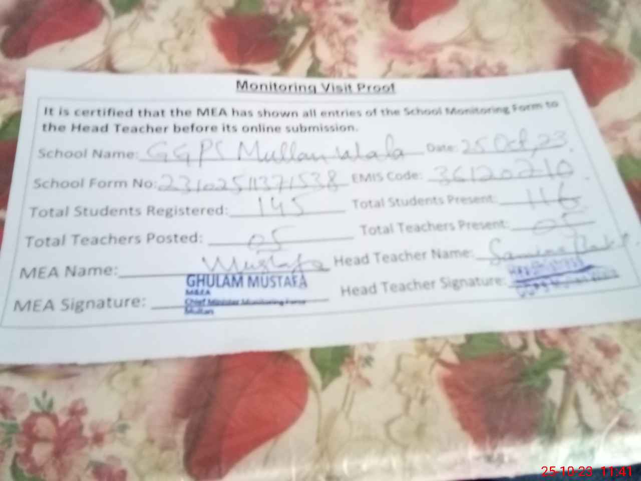 | EMIS Code: 36120210 | Name of School: GGPS MULLAN WALA SHUJABAD | |||