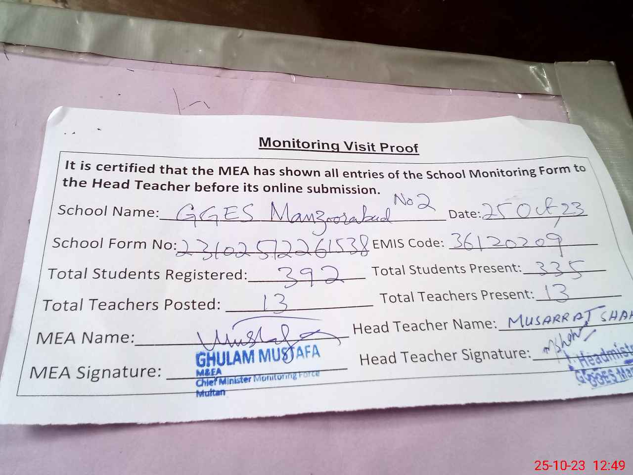 | Certified that this School was Inspected by the Undersigned MEA/DMO Today and the Information Stated Above is as Per Record. | |||||
