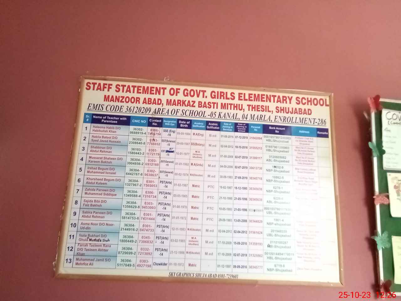| EMIS Code: 36120209 | Name of School: GGES MANZOOR ABAD NO.1 | |||