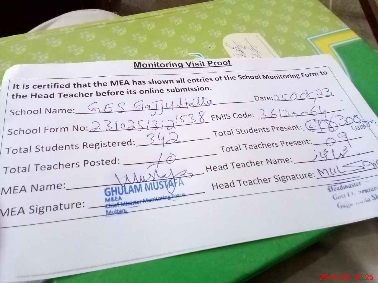 | Monitoring Date: 25-10-2023 | Start Time: 25-10-2023 01:06 PM | End Time: 25-10-2023 01:28 PM | Name of MEA: Gh**** Mu**** | |
