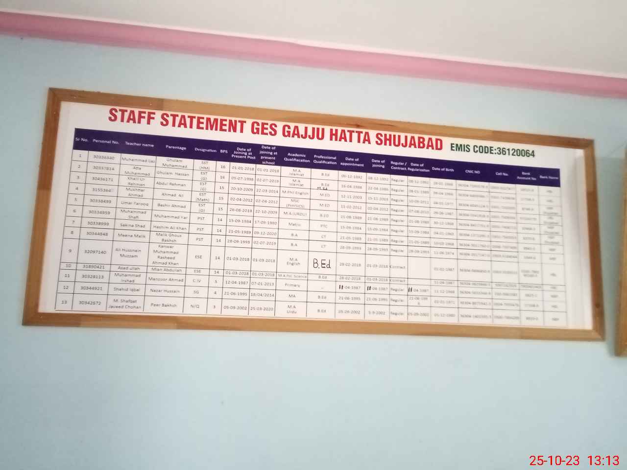 | EMIS Code: 36120064 | Name of School: GES GAJJU HATTA WARD NO 1 P/O SHUJABAD | |||
