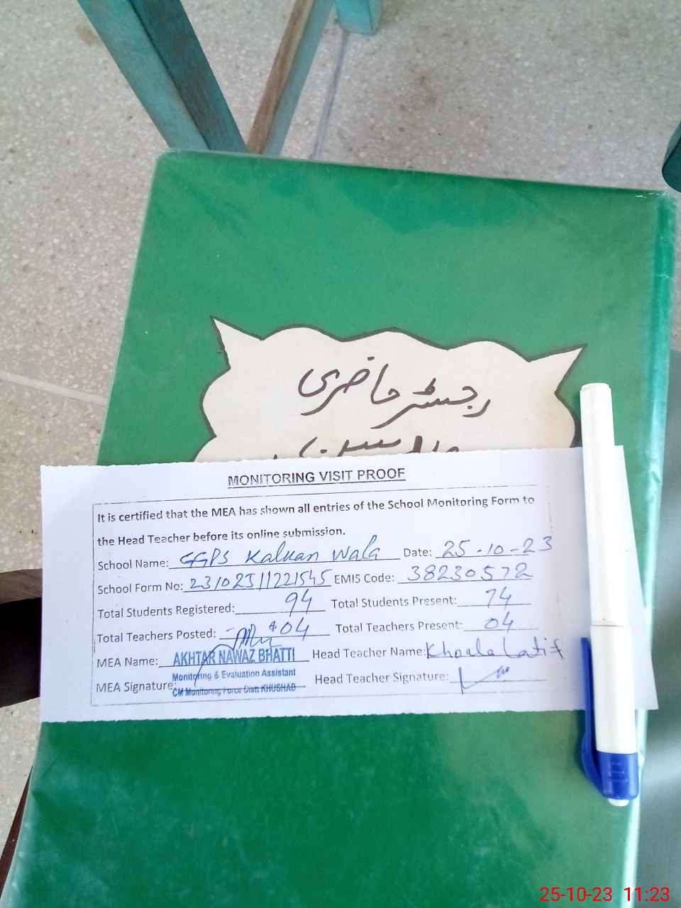 | Attendance Register | Head Teacher | MEA with School | Visit Proof |