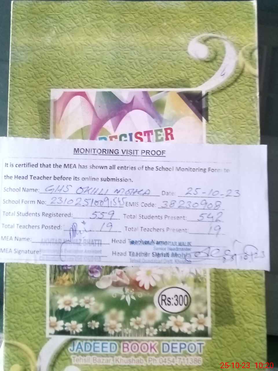 | Attendance Register | Head Teacher | MEA with School | Visit Proof |