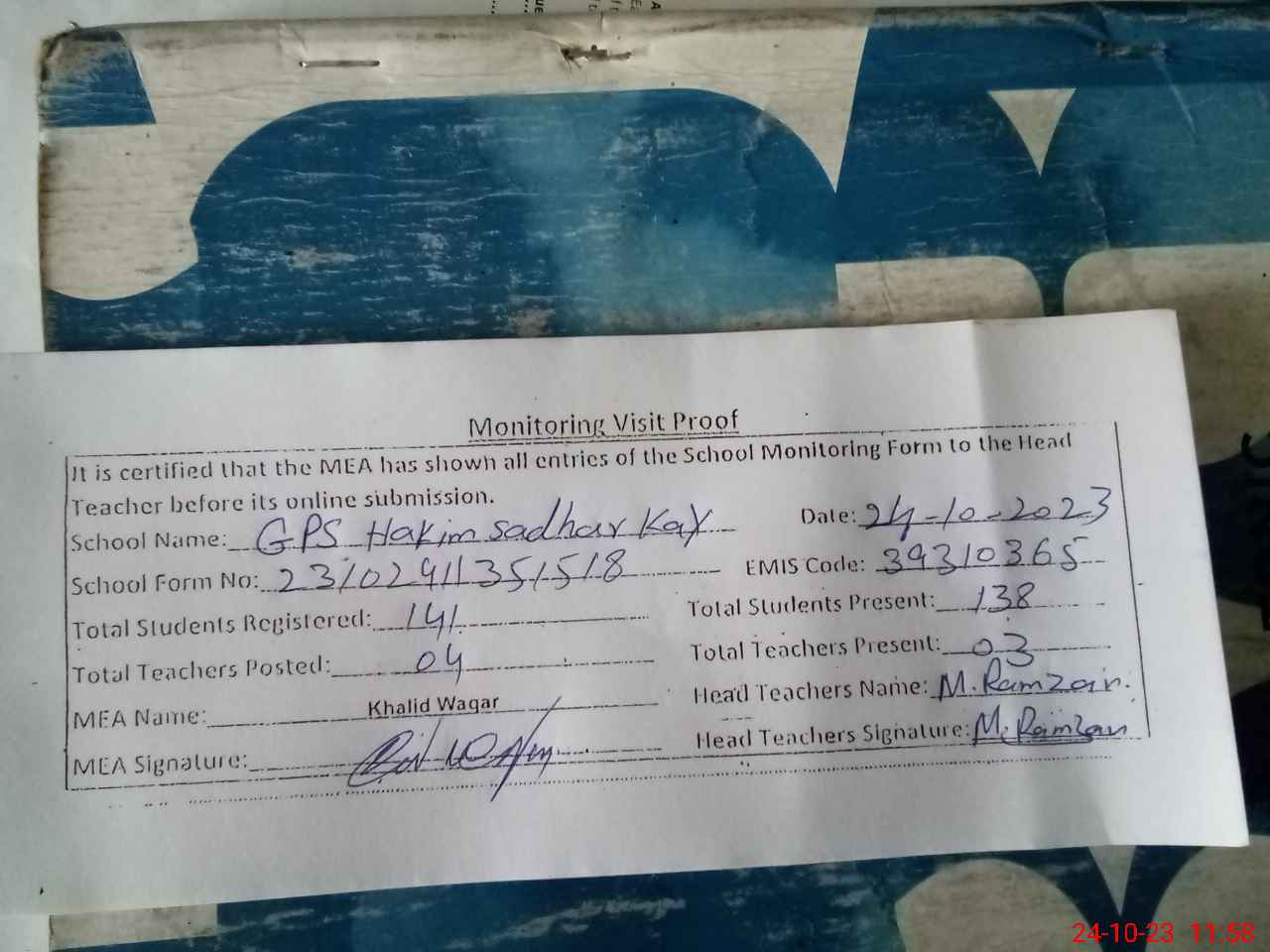 | Attendance Register | Head Teacher | MEA with School | Visit Proof |