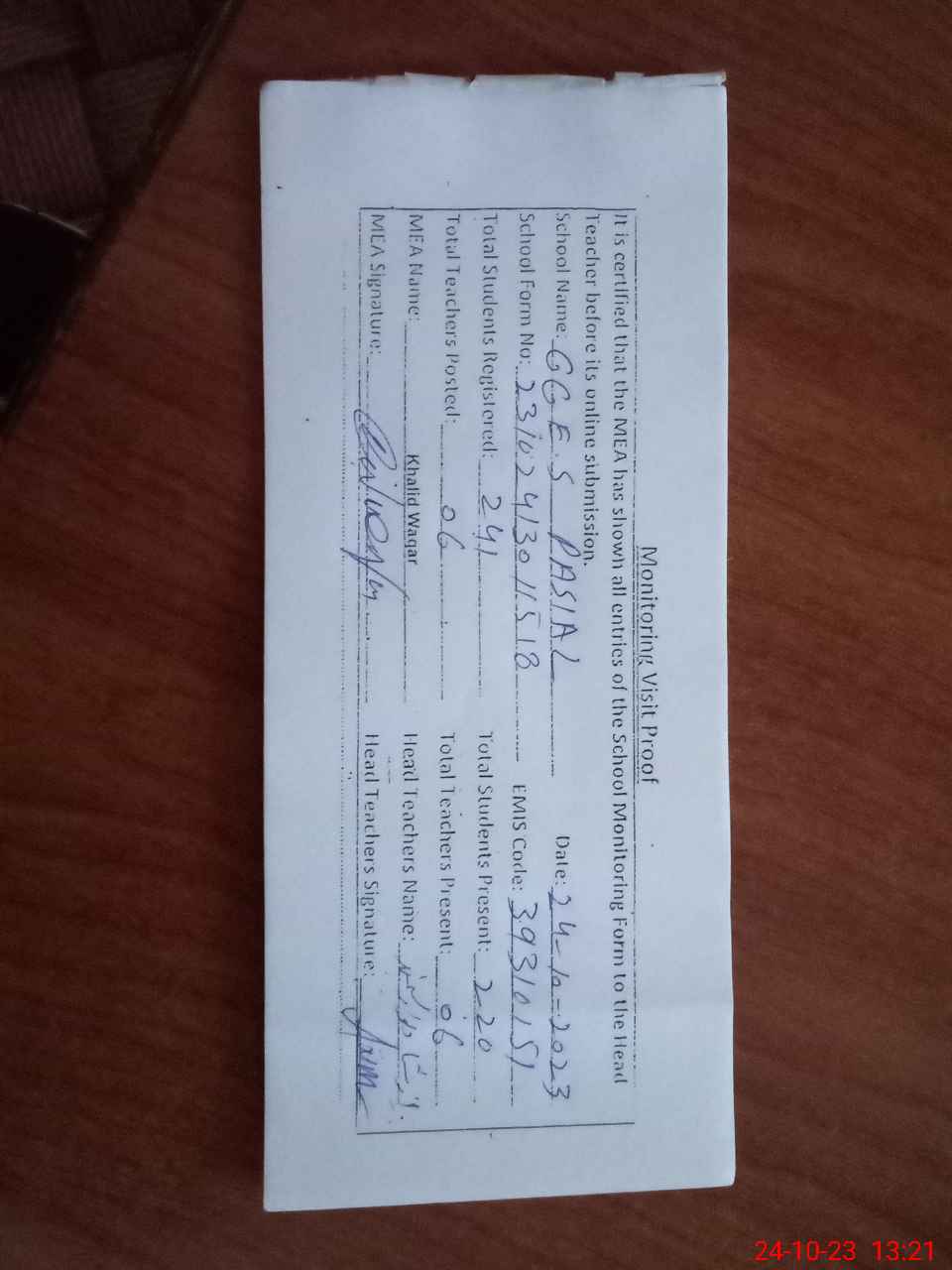 | Attendance Register | Head Teacher | MEA with School | Visit Proof |