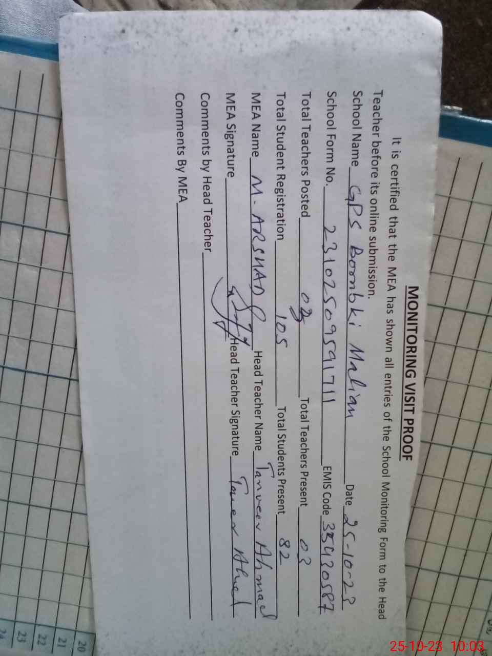 | Attendance Register | Head Teacher | MEA with School | Visit Proof |