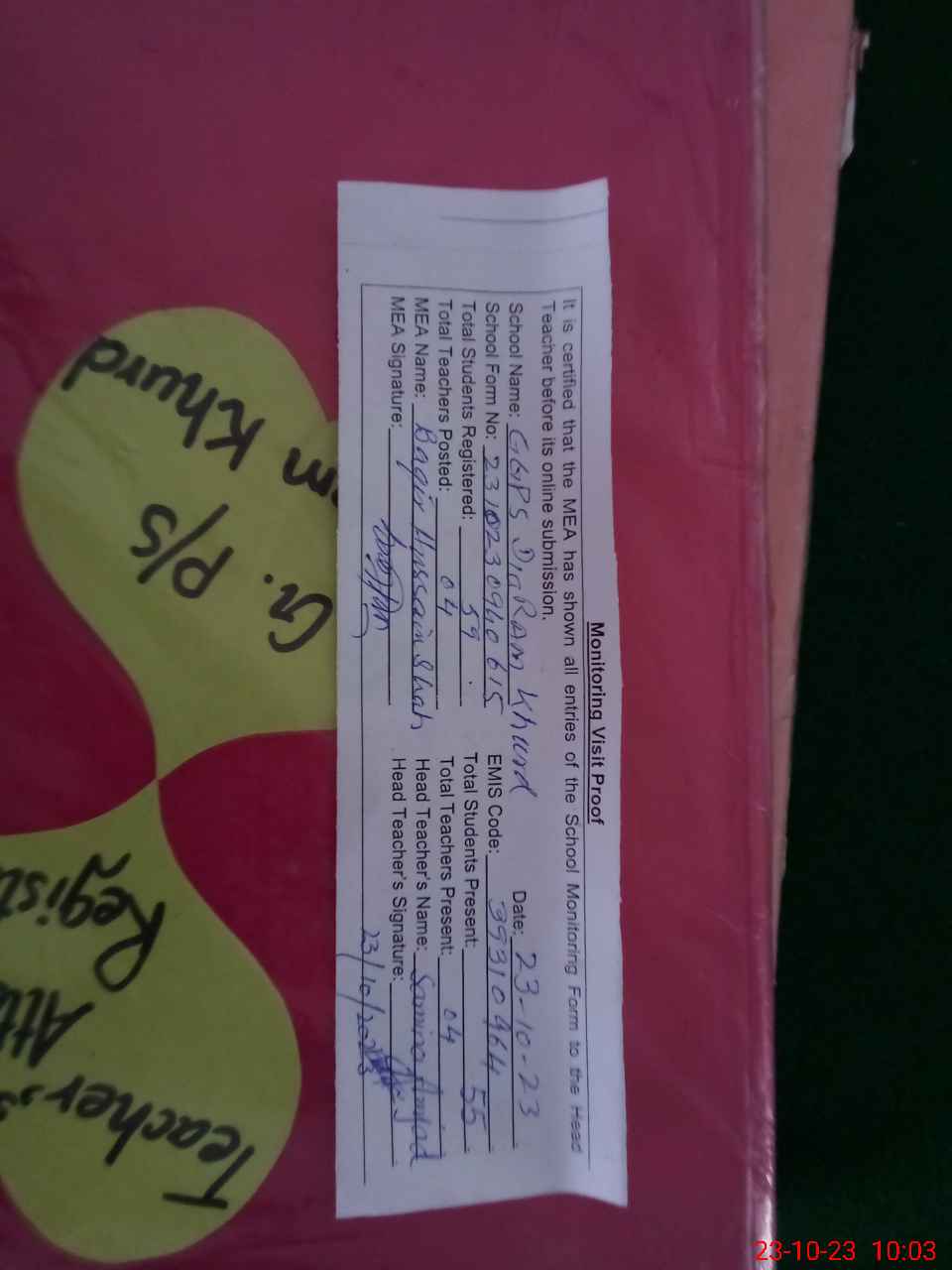 | Attendance Register | Head Teacher | MEA with School | Visit Proof |