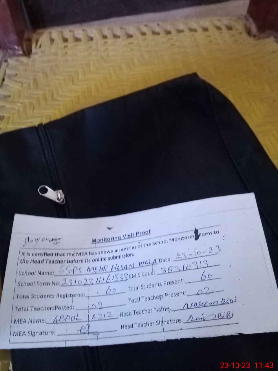 | Attendance Register | Head Teacher | MEA with School | Visit Proof |