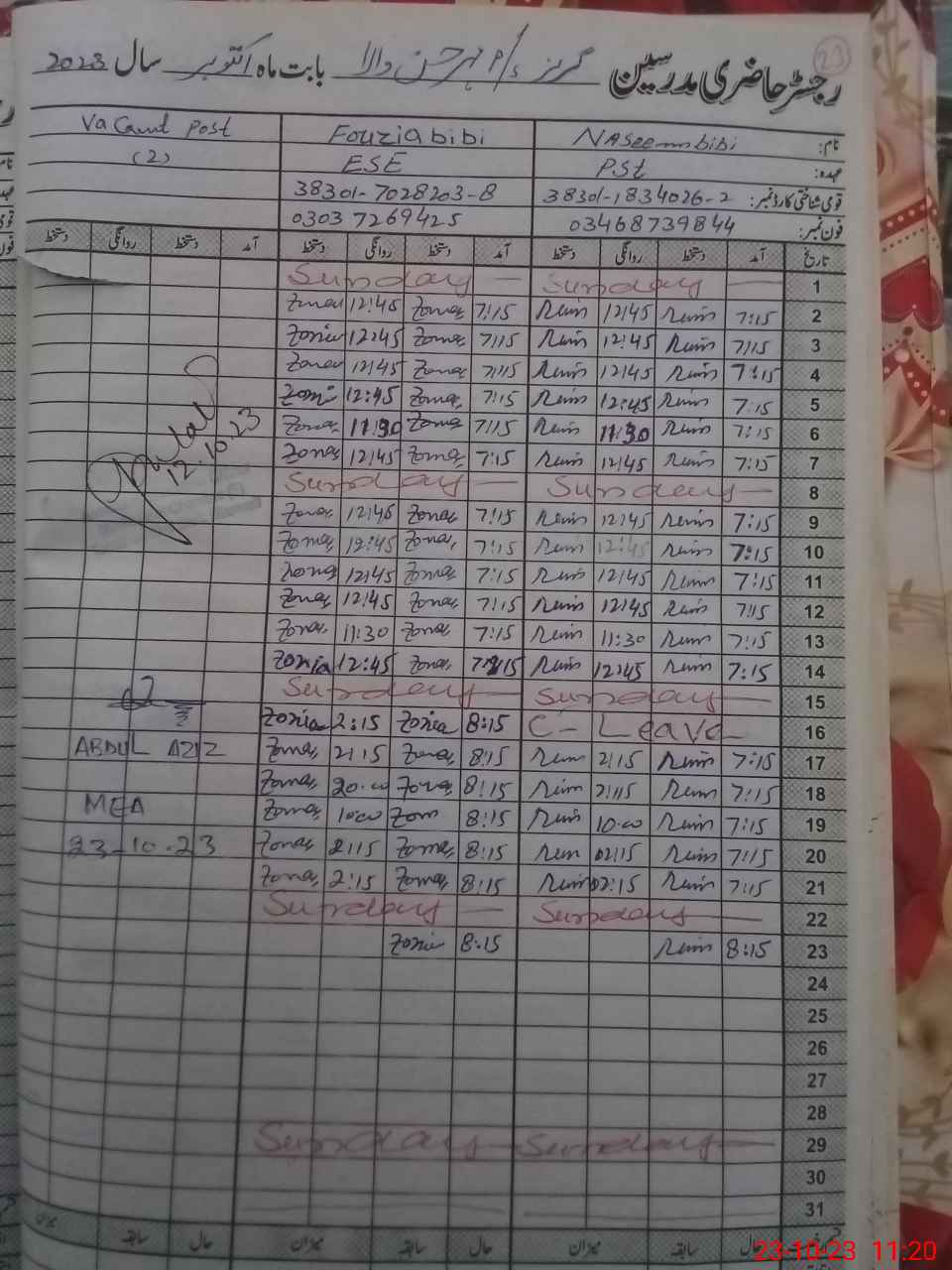 | CNIC | Full Name | Designation | R/C | Absence During Last Calender Month |