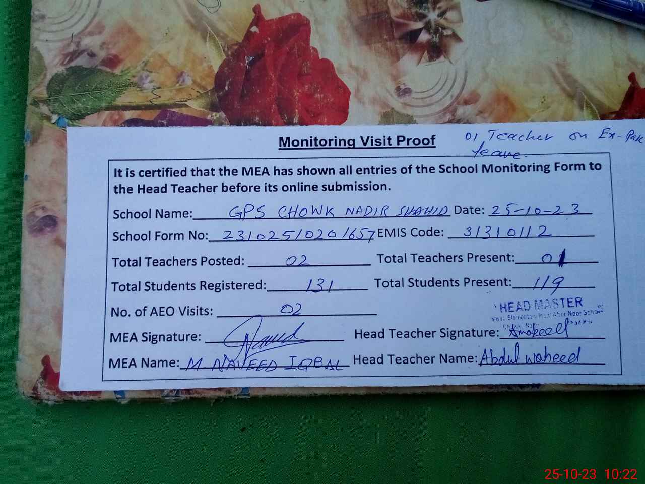 | Attendance Register | Head Teacher | MEA with School | Visit Proof |