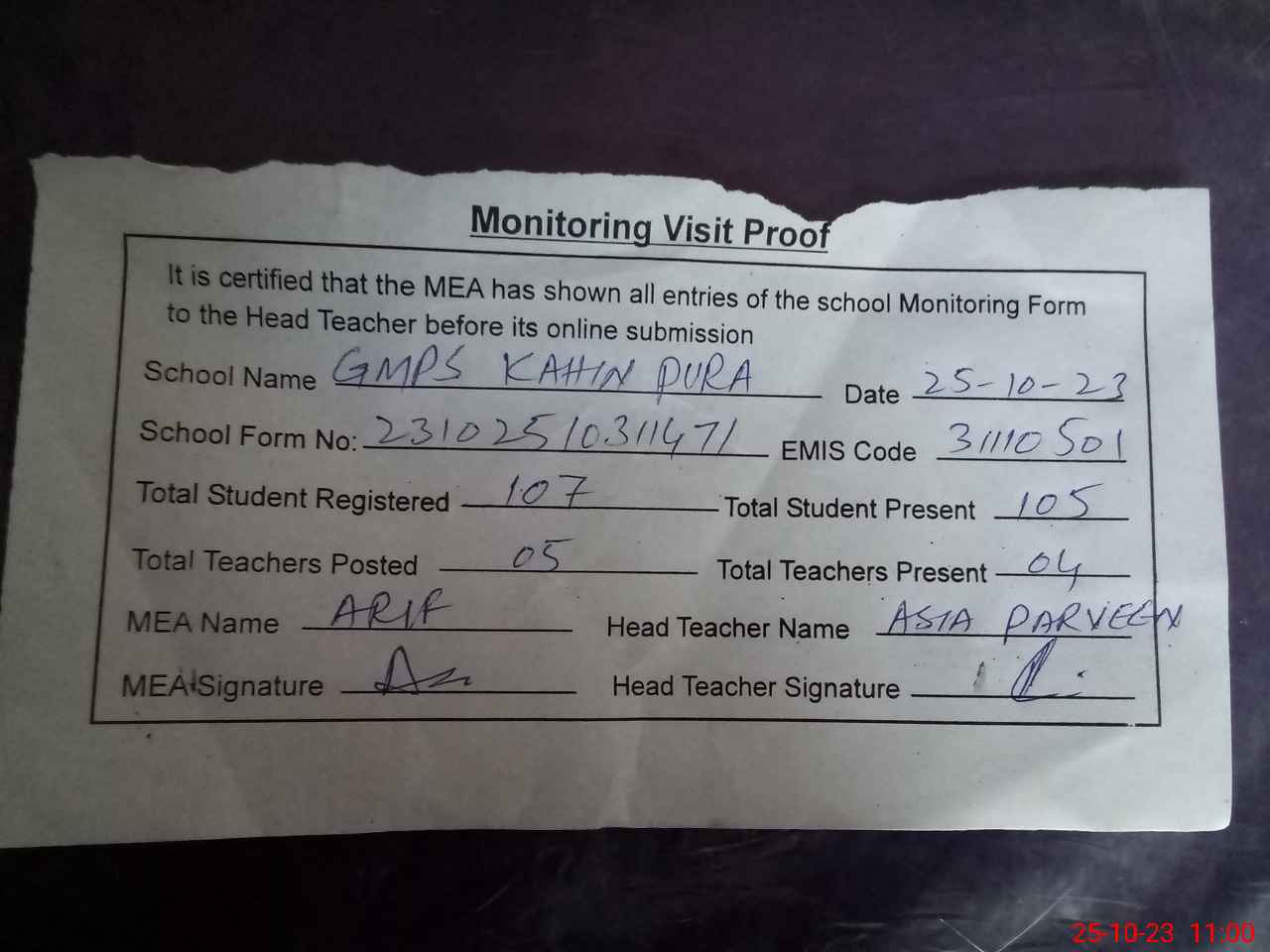 | Attendance Register | Head Teacher | MEA with School | Visit Proof |