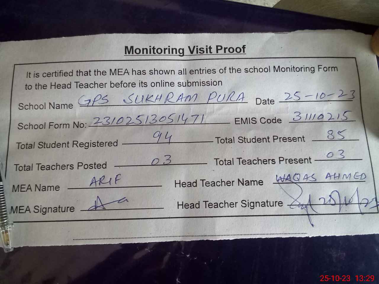 | Attendance Register | Head Teacher | MEA with School | Visit Proof |