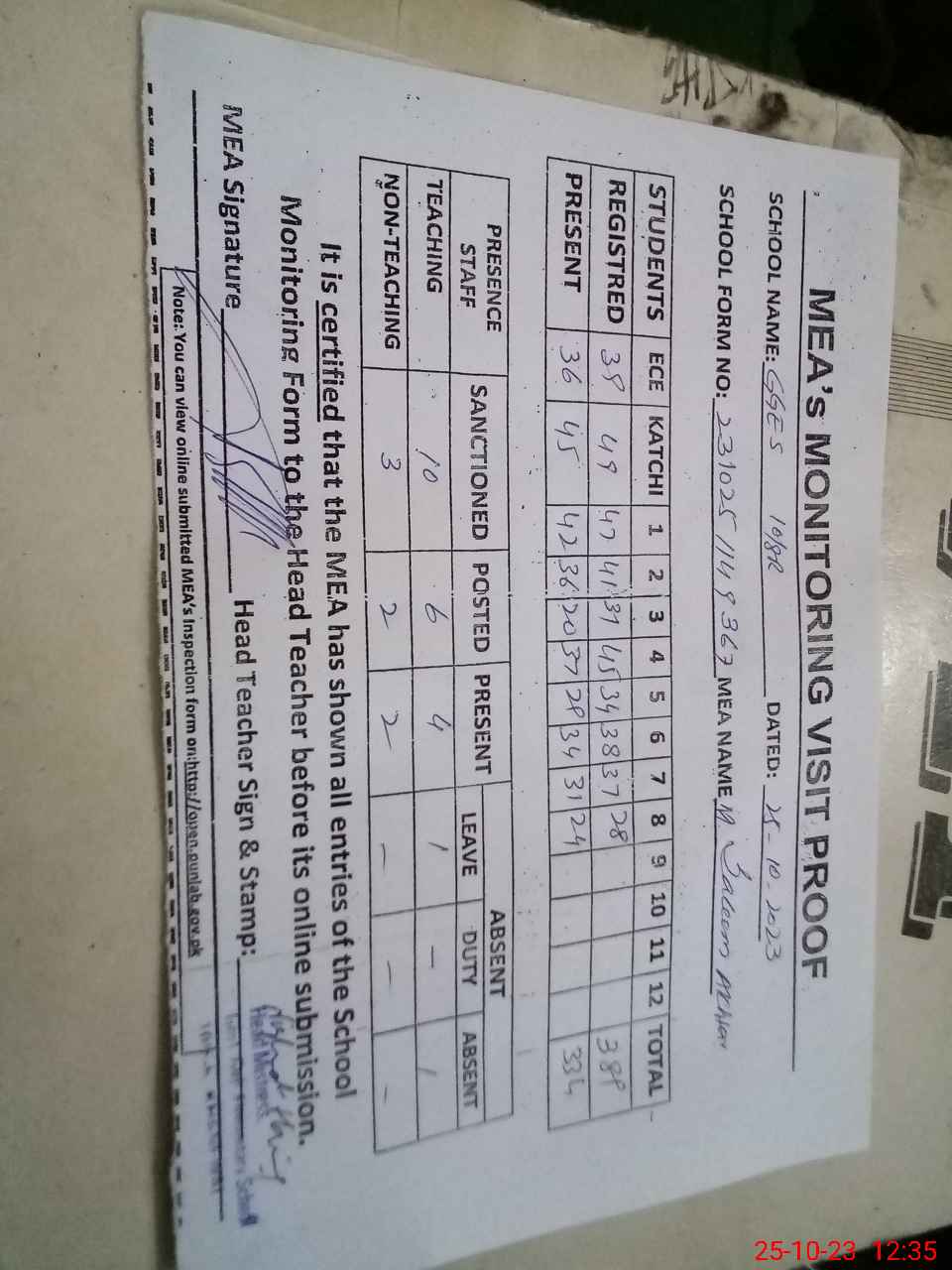 | Certified that this School was Inspected by the Undersigned MEA/DMO Today and the Information Stated Above is as Per Record. | |||||