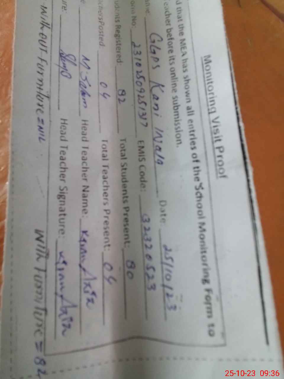 | EMIS Code: 32320523 | Name of School: GGPS KANI WALA | |||