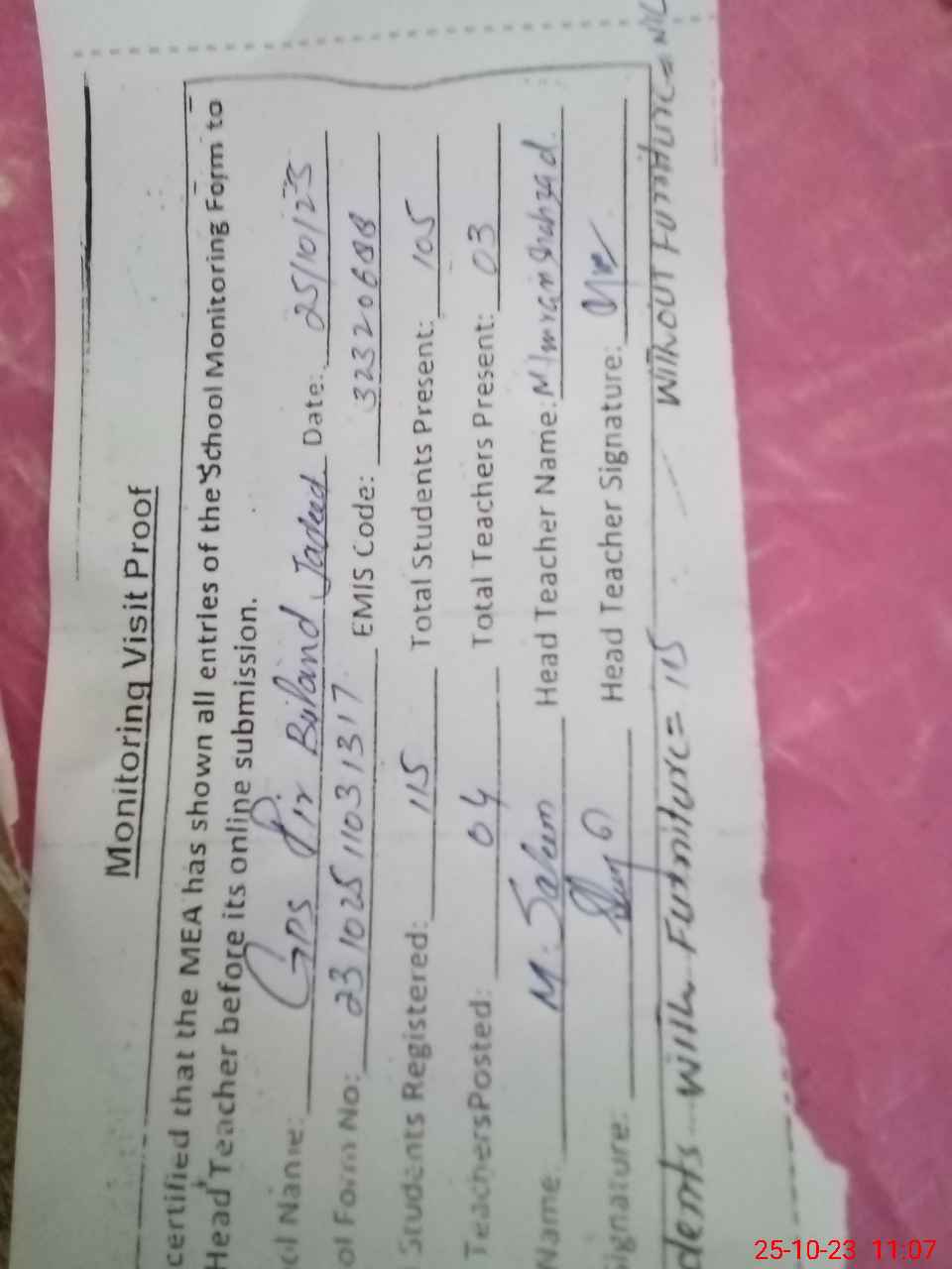 | EMIS Code: 32320688 | Name of School: GPS PIR BULAND JADEED | |||