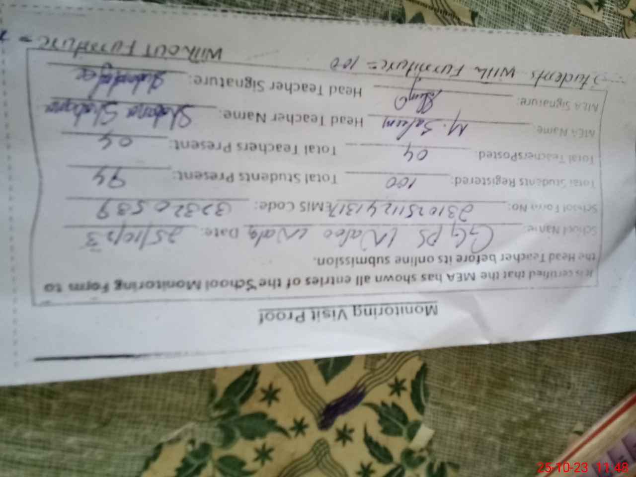 | Attendance Register | Head Teacher | MEA with School | Visit Proof |