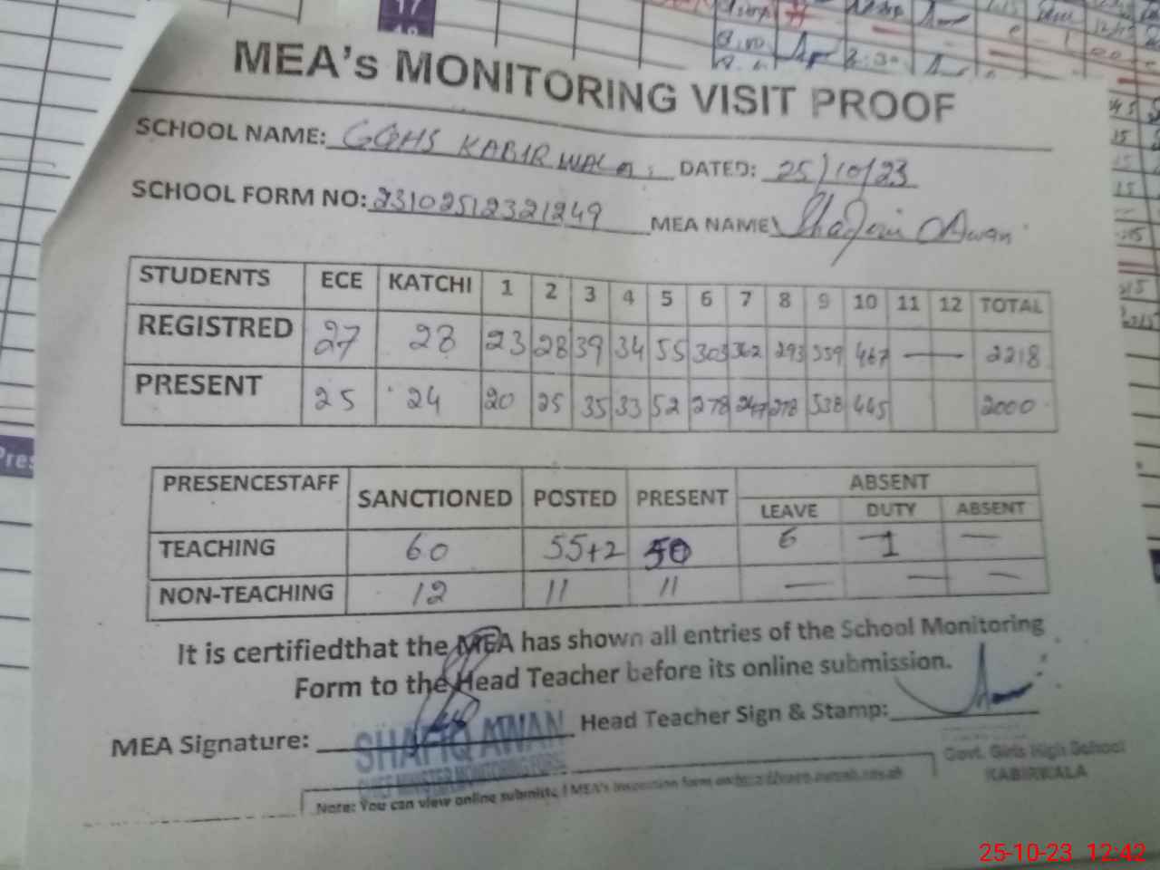 | Attendance Register | Head Teacher | MEA with School | Visit Proof |