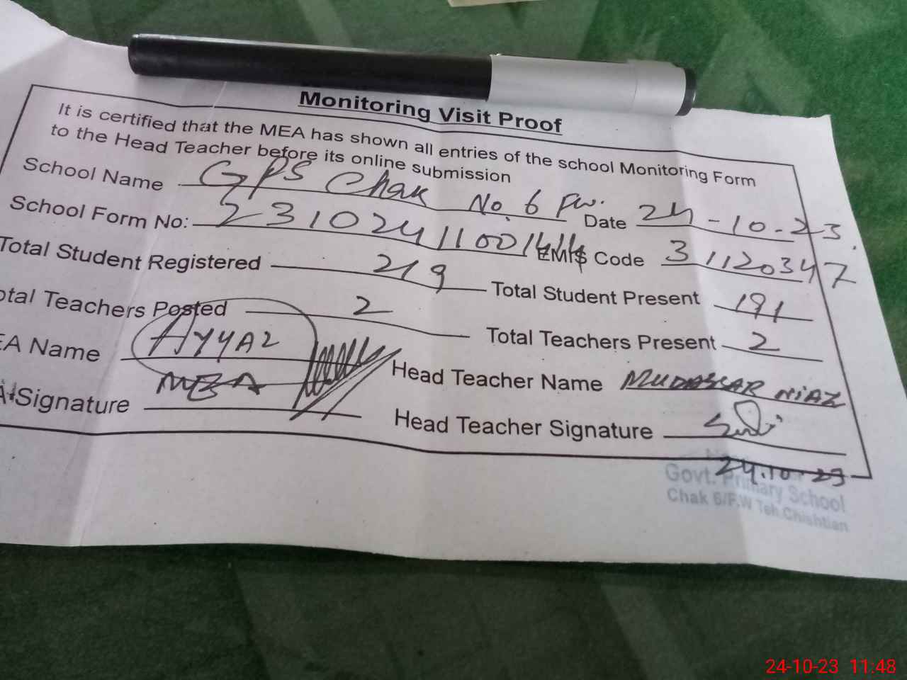 | Attendance Register | Head Teacher | MEA with School | Visit Proof |
