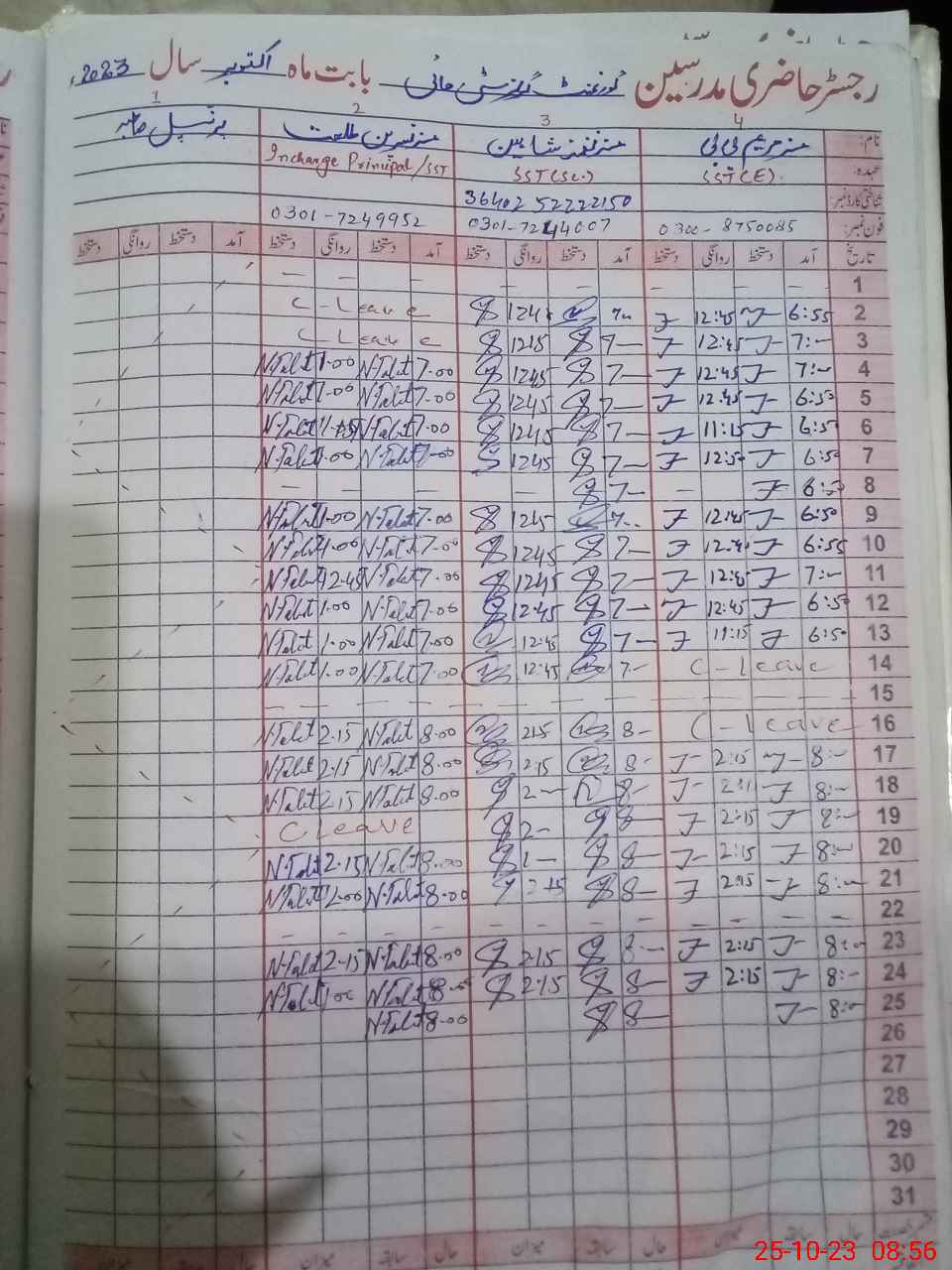 | CNIC | Full Name | Designation | R/C | Absence During Last Calender Month |