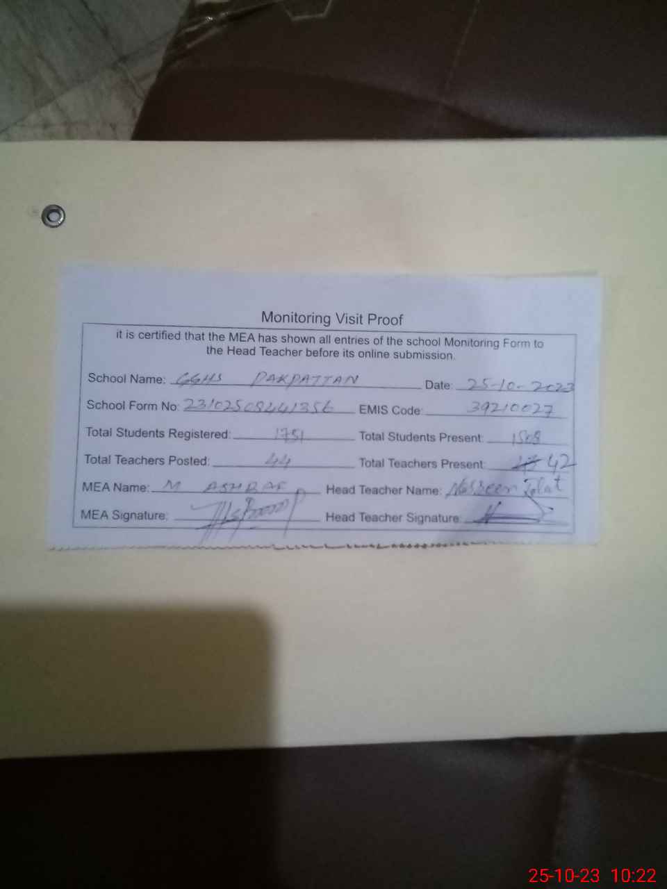 | Certified that this School was Inspected by the Undersigned MEA/DMO Today and the Information Stated Above is as Per Record. | |||||