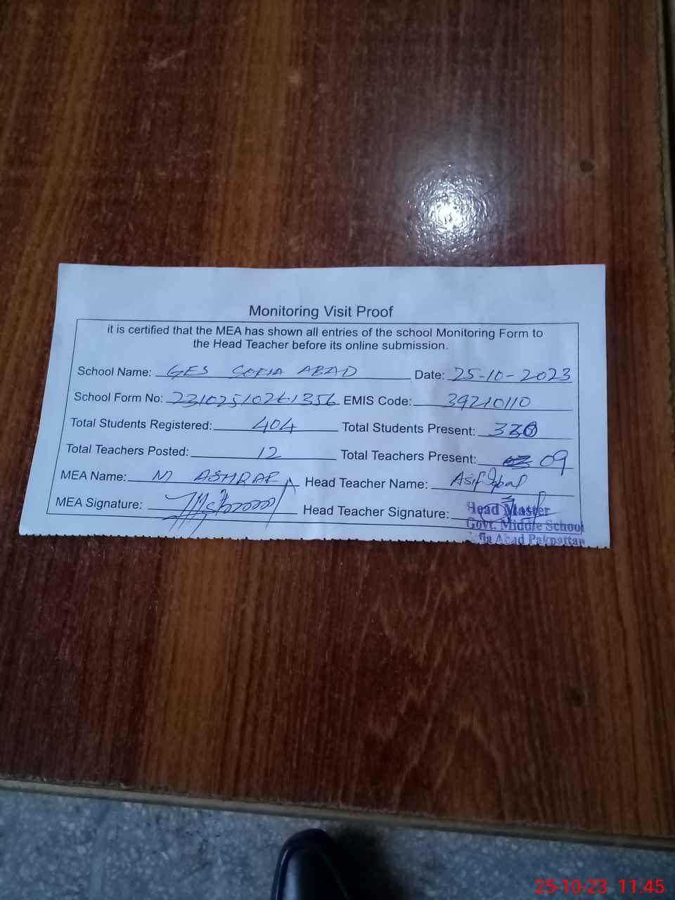 | Attendance Register | Head Teacher | MEA with School | Visit Proof |