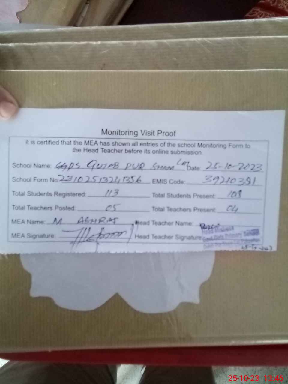 | Attendance Register | Head Teacher | MEA with School | Visit Proof |