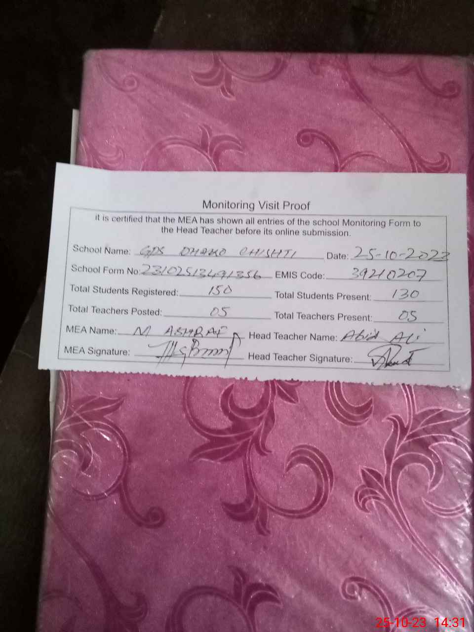| Attendance Register | Head Teacher | MEA with School | Visit Proof |