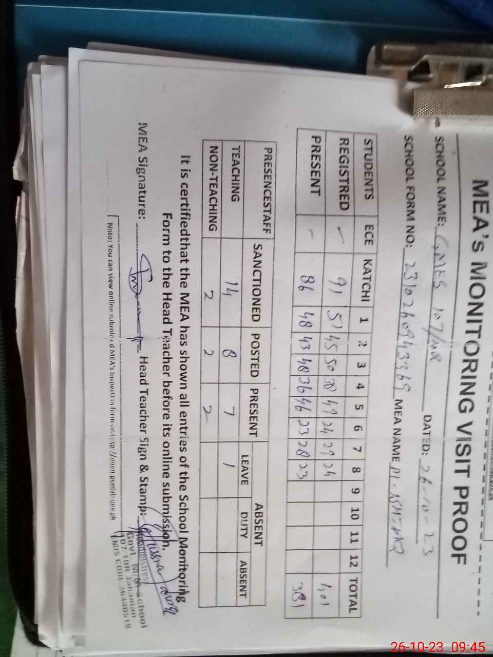 | Attendance Register | Head Teacher | MEA with School | Visit Proof |