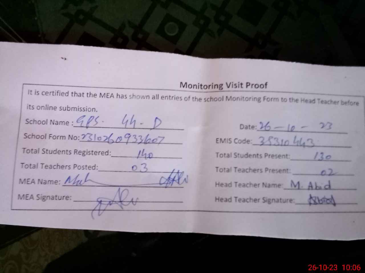 | Certified that this School was Inspected by the Undersigned MEA/DMO Today and the Information Stated Above is as Per Record. | |||||