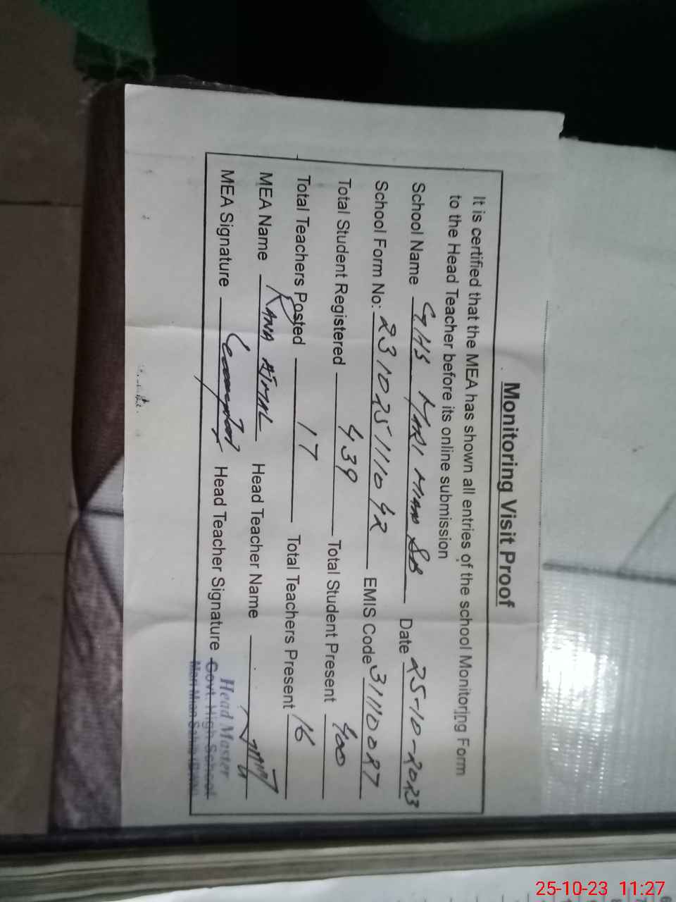 | Attendance Register | Head Teacher | MEA with School | Visit Proof |