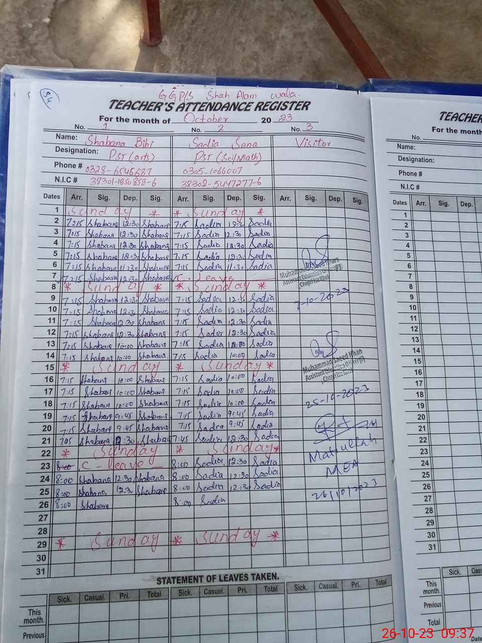 | Total no. of Classrooms: 4 No. of Classrooms Used for Teaching: 4 No. of Classrooms Storing Old Furniture, FTBs, etc: 0Comments if Any: Second shift students attendance were not endorse since 24 October general cleaning is not satisfactory |