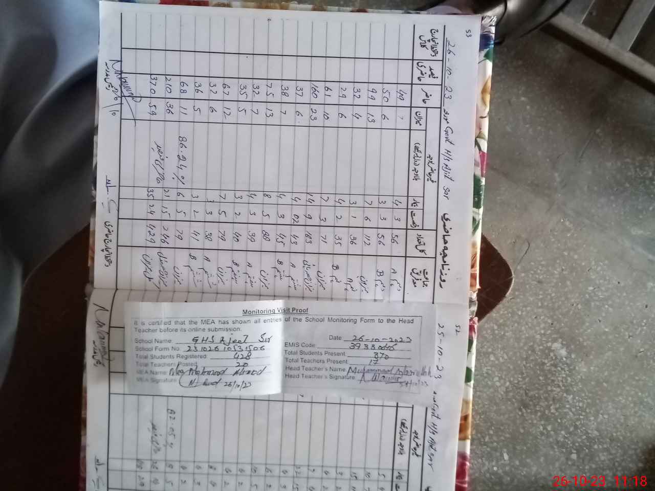 | Attendance Register | Head Teacher | MEA with School | Visit Proof |