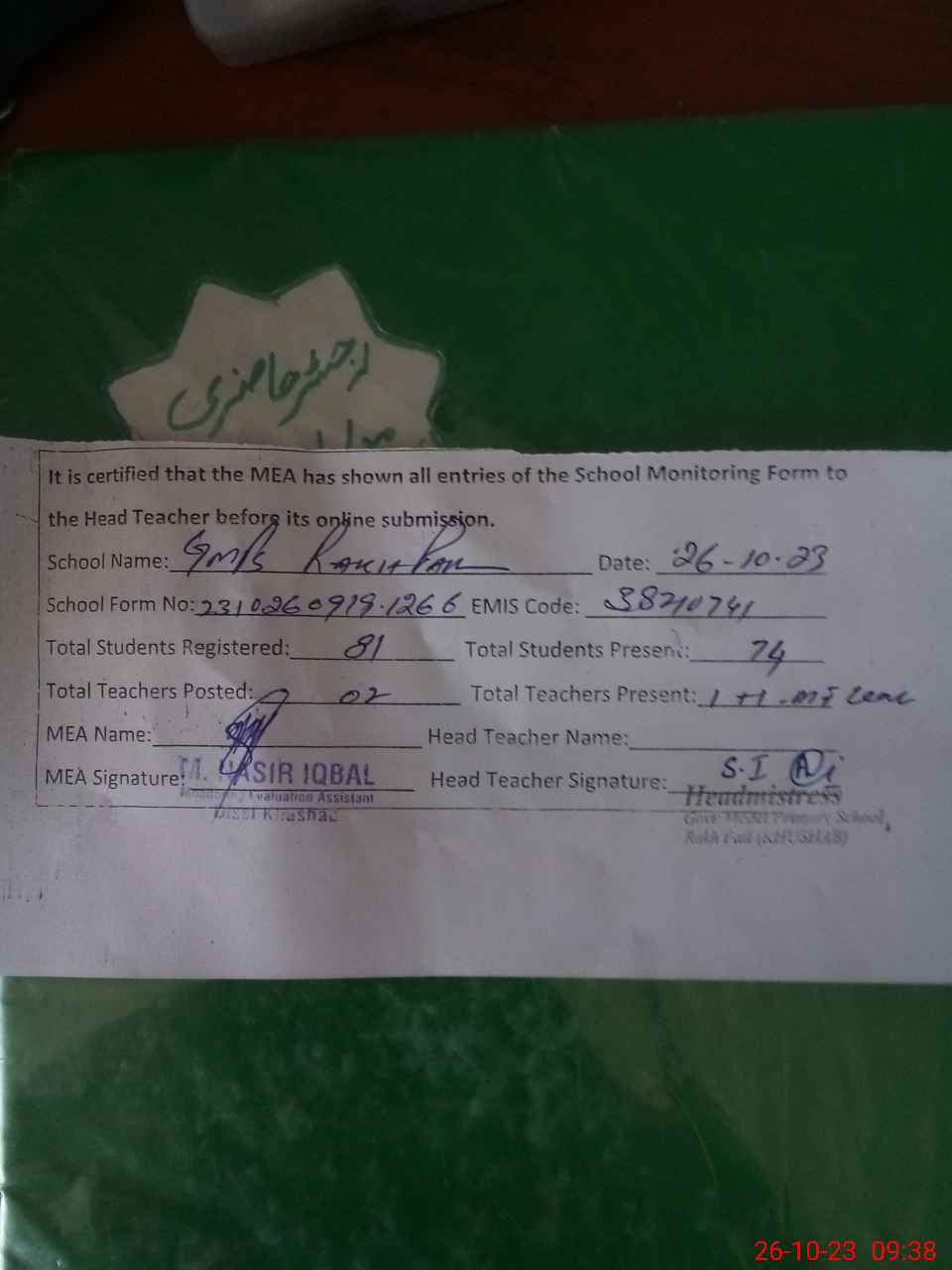 | Attendance Register | Head Teacher | MEA with School | Visit Proof |