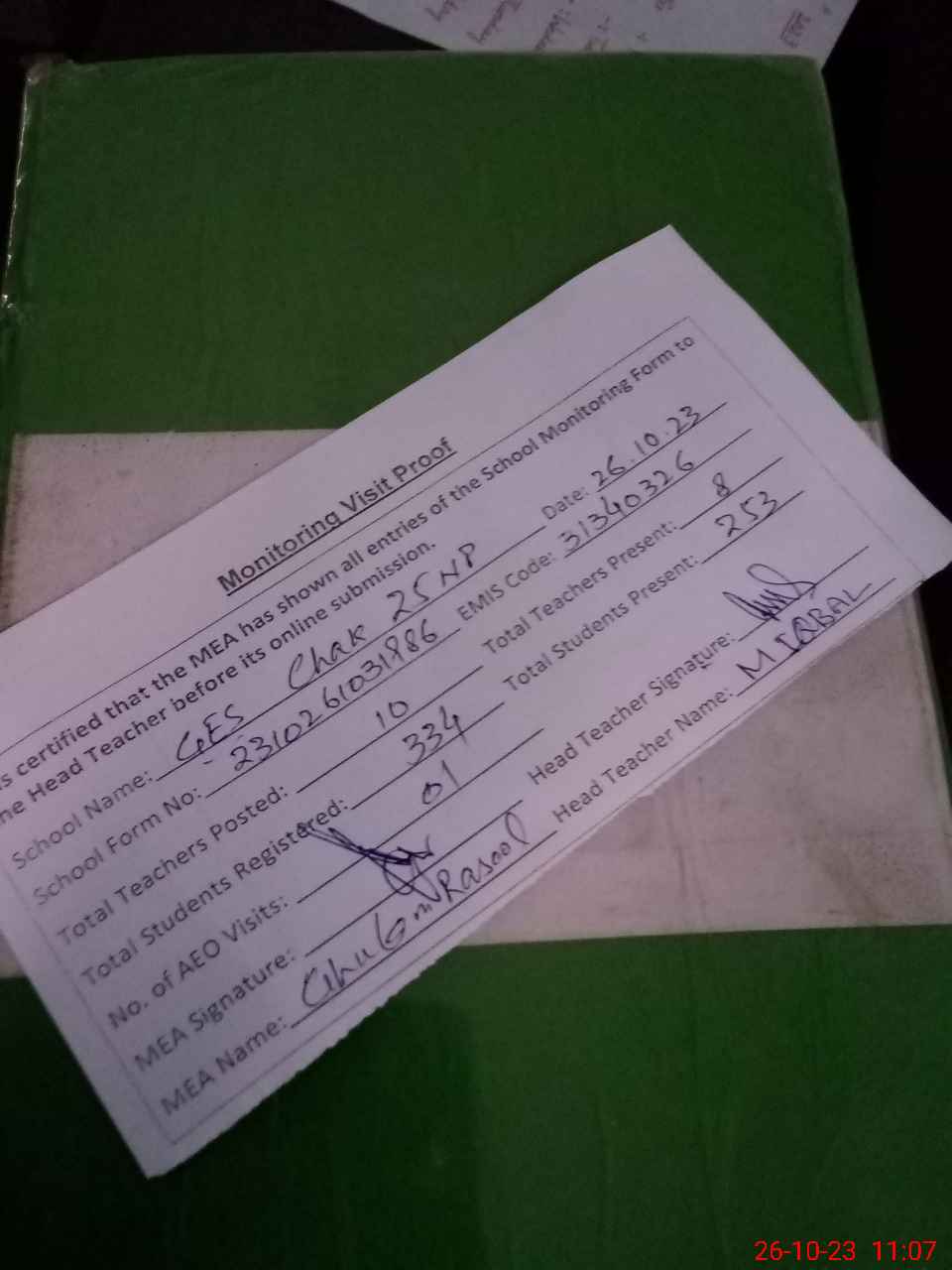 | Attendance Register | Head Teacher | MEA with School | Visit Proof |