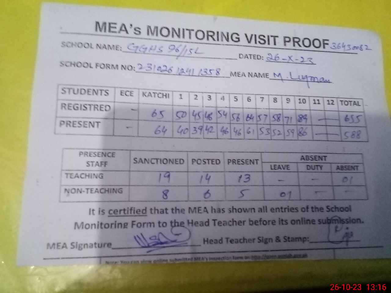 | Attendance Register | Head Teacher | MEA with School | Visit Proof |