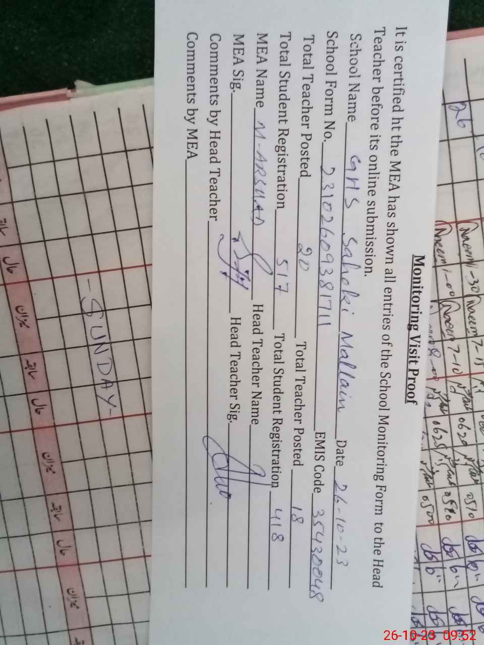 | Monitoring Date: 26-10-2023 | Start Time: 26-10-2023 08:55 AM | End Time: 26-10-2023 09:52 AM | Name of MEA: Mu**** Ar**** | |