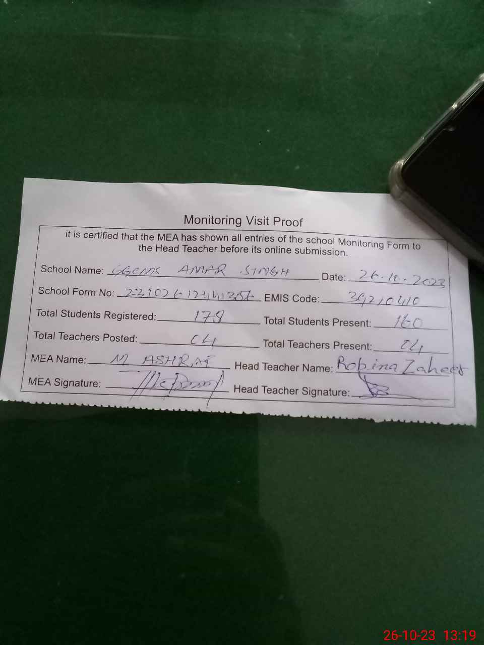 | Attendance Register | Head Teacher | MEA with School | Visit Proof |