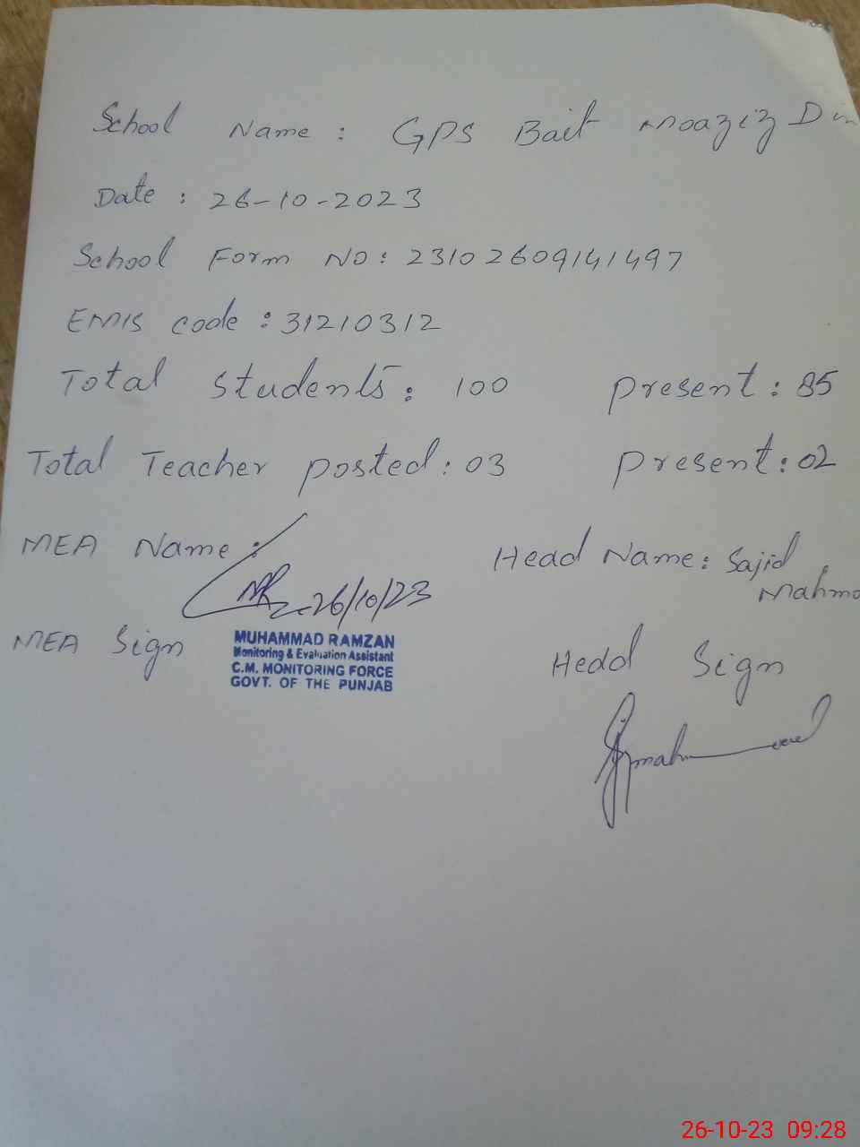 | EMIS Code: 31210312 | Name of School: GPS BAIT MOAZIZ-UD-DIN | |||