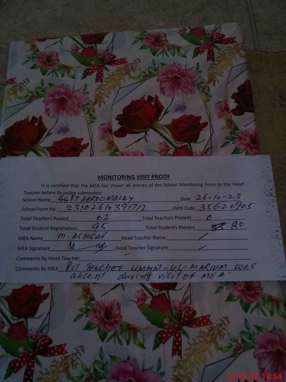 | Attendance Register | Head Teacher | MEA with School | Visit Proof |