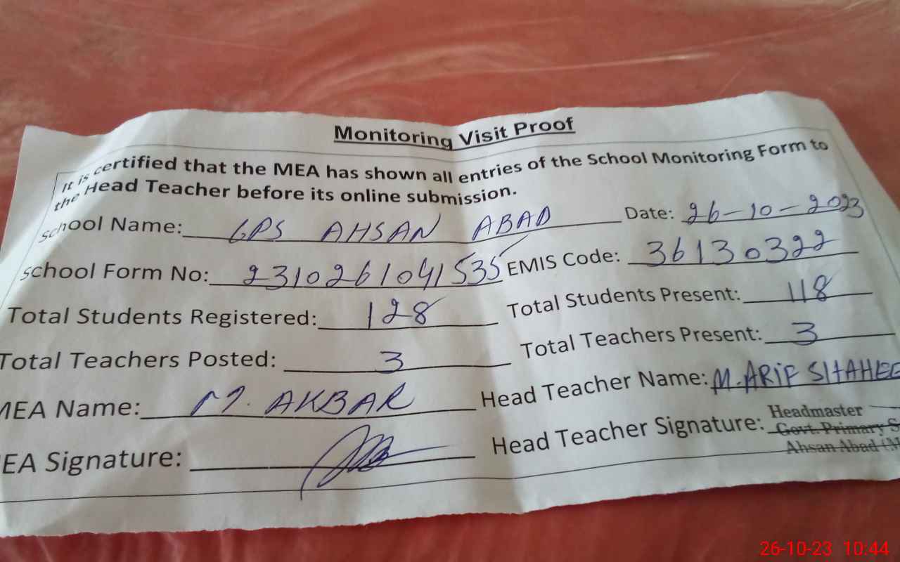 | EMIS Code: 36130322 | Name of School: GPS AHSAN ABAD | |||